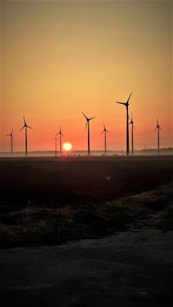 Sonnenaufgang zwischen Windrädern. |