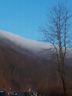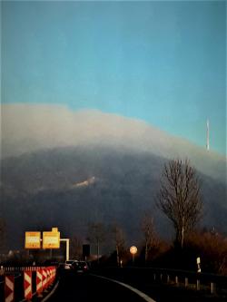 Nebelwand auf Bergkuppe. |